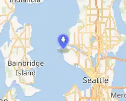 The park is one of the best places in the city to view wildlife, especially birds[2] and marine mammals.[3] The Seattle Audubon Society has compiled a checklist of 270 species of birds seen in the park and nearby waters.[4] Elliott and Shilshole Bays are home to harbor seals and California sea lions, while the wooded areas support Townsend's chipmunks. Most visitors enjoy hiking the Loop Trail, which forms a circuit through forest, meadow, and shrub habitats around the upland portion of the park, and provides excellent views of Puget Sound. Many historical buildings stand in semi disrepair in the main grassy area. The shoreline is accessible by road or trail (the hike back up from the north beach is mildly strenuous), however, a permit is required prior to driving a vehicle to the beach. Free permits can be obtained at the Environmental Learning Center in the East Parking Lot and are designated for qualified individuals only (groups with children 7 and under, seniors 62+, and people with a physical disability). The south beach is on the windward side of the peninsula, Elliott Bay, and the north beach is on the leeward side and has views of Shilshole Bay. At the point between the north and south beaches is West Point and the West Point Lighthouse. Coniferous forest is mostly to be found in the north bluff region and can be accessed from the road that leads to the beach. Deciduous woods surround the two parking lots and the visitor center. Overlooking the south bluff is a large meadow with small trees and shrubs. Bigleaf maple, red alder, bitter cherry, Douglas-fir, western red cedar, and western hemlock make up a large percentage of the tree cover in the park.[5] Invasive species such as Himalayan blackberry, Scot's broom, English ivy, and holly are present throughout, requiring active on-going management to suppress.[6]