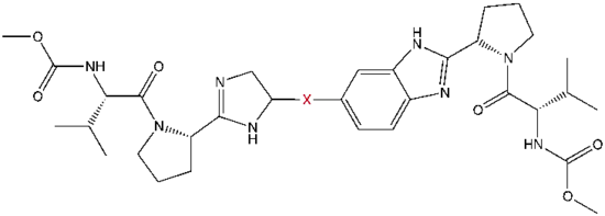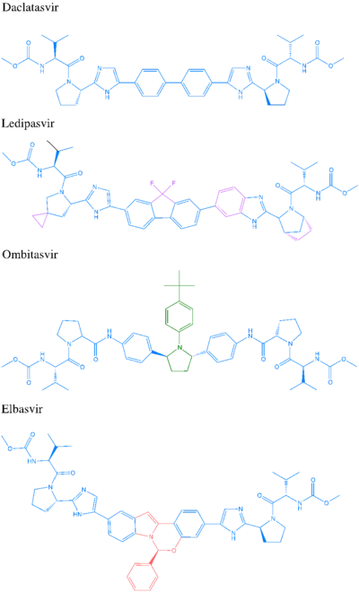 Nonstructural protein 5A (NS5A) inhibitors are direct acting antiviral agents (DAAs) that target viral proteins, and their development was a culmination of increased understanding of the viral life cycle combined with advances in drug discovery technology.[1][2] However, their mechanism of action is complex and not fully understood.[2] NS5A inhibitors were the focus of much attention when they emerged as a part of the first curative treatment for hepatitis C virus (HCV) infections in 2014.[3] Favorable characteristics have been introduced through varied structural changes, and structural similarities between NS5A inhibitors that are clinically approved are readily apparent.[4][5] Despite the recent introduction of numerous new antiviral drugs, resistance is still a concern and these inhibitors are therefore always used in combination with other drugs.[6][7]
