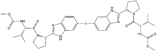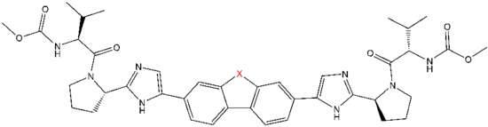 Favorable characteristics in an NS5A inhibitor include high potency and long plasma half-life in order to achieve a once-daily-dosage. Slightly asymmetrical appendages, as seen in ledipasvir, were found to have distinctive benefits for the optimization of inhibitor potency and pharmacokinetics.[51] The structure of the central core changes the spacing and the projection of the appendages as well as the position of the lipophilicity in the central core, which affects inhibitory activity notably. Structures with fused central rings consistently show greater inhibitory activity, whereas less lipophilic central cores provide weaker activity.[4] Symmetrical bis-imidazol structures, such as daclatasvir, experience a loss in potency when fluorene is substituted for the biaryl group. This substitution also gives rise to some serious stability problems.[51][56] However, a smaller lipophilic connector such as difluoromethylene generates the most potent inhibitor in an asymmetrical structure. Additionally, it provides improved bioavailability and more favorable plasma half-life. There is also a remarkable increase in potency when phenyl is replaced with naphthyl as a central core. This increase is significantly higher in an asymmetrical structure than it is in a symmetrical structure.[51][55] In asymmetrical structures, a difference in potency between the phenyl-alkyne inhibitors demonstrates the importance of the position of the lipophilicity. A more centrally located alkyne, which is a less lipophilic connector than phenyl, improves potency.[4][5][51]