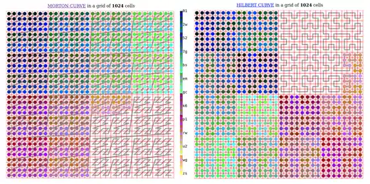 | Geohash: Latitude and longitude are merged, enterlacing bits in the joined number. The binary result is represented with base32, offering a compact human-readable code. When used as spatial index, corresponds to a Z-order curve. There are some variants like Geohash-36. | ![]() | |||