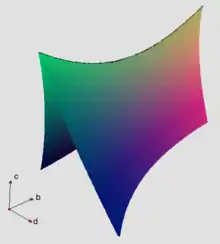 The zero set of discriminant of the cubic x3 + bx2 + cx + d, i.e. points satisfying b2c2 – 4c3 – 4b3d – 27d2 + 18bcd = 0.