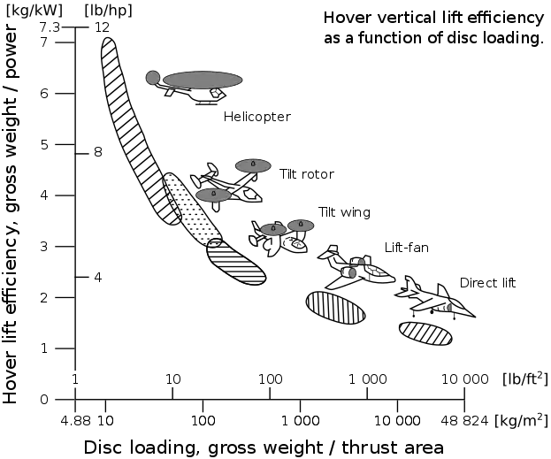 Correlation between disc loading and hover lift efficiency, for various VTOL aircraft