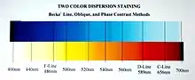 The dispersion staining is an analytical technique used in light microscopy that takes advantage of the differences in the dispersion curve of the refractive index of an unknown material relative to a standard material with a known dispersion curve to identify or characterize that unknown material. These differences become manifest as a color when the two dispersion curves intersect for some visible wavelength. This is an optical staining technique and requires no stains or dyes to produce the color. Its primary use today is in the confirmation of the presence of asbestos in construction materials[1][2][3] but it has many other applications.[4][5][6][7][8][9]