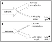 The disposable soma theory of aging states that organisms age due to an evolutionary trade-off between growth, reproduction, and DNA repair maintenance.[1] Formulated by Thomas Kirkwood, the disposable soma theory explains that an organism only has a limited amount of resources that it can allocate to its various cellular processes.[2] Therefore, a greater investment in growth and reproduction would result in reduced investment in DNA repair maintenance, leading to increased cellular damage, shortened telomeres, accumulation of mutations, compromised stem cells, and ultimately, senescence. Although many models, both animal and human, have appeared to support this theory, parts of it are still controversial. Specifically, while the evolutionary trade-off between growth and aging has been well established, the relationship between reproduction and aging is still without scientific consensus, and the cellular mechanisms largely undiscovered.[3]