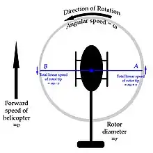 Consider a single-rotor helicopter in still air. For a stationary (hovering) helicopter, whose blades of length of r metres are rotating at ω radians per second, the blade tip is moving at a speed rω meters per second. As the blades rotate, the speed of the blade-tips relative to the air remains constant.