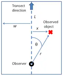 A common approach to distance sampling is the use of line transects. The observer traverses a straight line (placed randomly or following some planned distribution). Whenever they observe an object of interest (e.g., an animal of the type being surveyed), they record the distance from their current position to the object (r), as well as the angle of the detection to the transect line (θ). The distance of the object to the transect can then be calculated as x = r * sin(θ). These distances x are the detection distances that will be analyzed in further modeling.