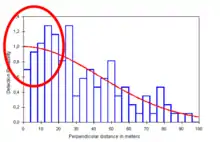 | Measurements (angles and distances) are exact | Random errors are negligible, but systematic errors may introduce bias. This often happens with rounding of angles or distances to preferred ("round") values, resulting in heaping at particular values. Rounding of angles to zero is particularly common | Avoid dead reckoning in the field by using range finders and angle boards. Post-hoc smoothing of data by partitioning into detection intervals is effective in addressing minor biases | ![]() An indication of angle rounding to zero in the data - there are more detections than expected in the very first data interval |