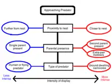 Several considerations involving the predator have been shown to be important, including the distance of the predator from the nest. Intensity of display has been shown to decrease as the distance of the predator from the nest increases, perhaps representing the balancing of risk to the displaying parent and to the vulnerable young.[25] The type of predator has also been shown to be of importance,[17] with birds tending to display most intensely to ground-dwelling carnivores and less intensely to humans and flying predators.[13][33][34] Finally, the number of potential predators has also been shown to be important in sticklebacks, in which frequency of distraction displaying by the male is positively correlated with the number of conspecifics in a foraging shoal.[8]