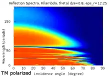 For TE and TM incidence we have the reflection spectra of a DBR stack, corresponding to a 6 layer stack of dielectric contrast of 11.5, between an air and dielectric layers. The thicknesses of the air and dielectric layers are 0.8 and 0.2 of the period, respectively. The wavelength in the figures below, corresponds to multiples of the cell period.