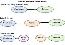 A firm can design any number of channels they require to reach customers efficiently and effectively. Channels can be distinguished by the number of intermediaries between producer and consumer.[5] If there are no intermediaries then this is known as a zero-level distribution system or direct marketing. A level one (sometimes called one-tier) channel has a single intermediary. A level two (alternatively a two-tier) channel has two intermediaries, and so on. This flow is typically represented as being manufacturer to retailer to consumer, but may involve other types of intermediaries. In practice, distribution systems for perishable goods tend to be shorter - direct or single intermediary, because of the need to reduce the time a product spends in transit or in storage. In other cases, distribution systems can become quite complex involving many levels and different types of intermediaries.