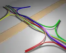 A free-flowing interchange variant, patented in 2015,[32] has received recent attention.[33][34][35] Called the double crossover merging interchange (DCMI), it includes elements from the diverging diamond interchange, the tight diamond interchange, and the stack interchange. It eliminates the disadvantages of weaving and of merging into the outside lane from which the standard DDI variation suffers. A highway U-turn requires weaving, however. As of 2016, no such interchanges have been constructed.