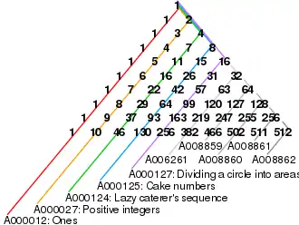 | The series alternatively derived from the sum of up to the first 5 terms of each row of Pascal's triangle[1] | |||||||