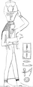 Several daughters of Djedkare have been identified by the title of "king's daughter of his body" and the general date of their tomb. These include Kekheretnebti,[note 9][49] whose filiation is clearly indicated by her other title of "Beloved of Isesi",[74] Meret-Isesi,[note 10][49] Hedjetnebu,[note 11][75][49] and Nebtyemneferes.[note 12][49] Less certain is the filiation of Kentkhaus, wife of vizier Senedjemib Mehi, who bore the title of "king's daughter of his body".[76][77] It is debated whether this title indicates a true filiation or if it is only honorary.[77][78]