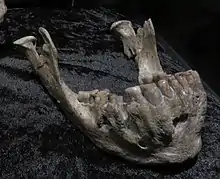 More discoveries followed. In 2000, another hominin jaw (D2600) was discovered,[3] this time at a slightly lower layer (i.e. older) than the rest of the fossils.[13] This jaw was very large and had highly developed posterior molar teeth. The following year, Skull 3 (D2700) and its corresponding jaw (D2735) was discovered, almost perfectly preserved.[14] On account of its erupting wisdom teeth, Skull 3 was determined to be the skull of a subadult.[4] In 2002, the toothless skull of an old individual, Skull 4 (D3444, the associated jaw, D3900, was discovered in 2003) was discovered. Both Skull 3 and Skull 4 were noted as preserving a series of very primitive characteristics. The final skull, Skull 5 (D4500), was discovered in 2005. The skull matched the jaw found in 2000 and the two were concluded as having come from the same individual.[3] The skulls were significant not only in their set of unique features. Skull 5 was the first found completely preserved adult hominin skull from the Early Pleistocene,[4] and Skull 4 is the only toothless hominin discovered in such early sediments.[15]