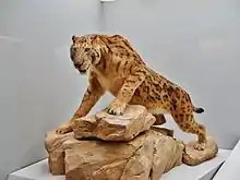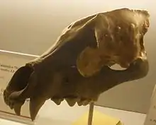 Animal fossils recovered in the same sediments as the hominin remains demonstrate that Pleistocene Dmanisi would have been home to a highly diverse fauna,[31] including pikas,[73] lizards, hamsters, tortoises, hares, jackals and fallow deer.[10] Most of the animals found are Villafranchian (a European land mammal age) mammals and several extinct species are represented, including Megantereon megantereon and Homotherium crenatidens (both saber-toothed cats), Panthera gombaszoegensis (the European jaguar), Ursus etruscus (the Etruscan bear), Equus stenonis (the Stenon zebra), Stephanorhinus etruscus (the Etruscan rhinoceros), Pachystruthio dmanisensis (the giant ostrich), deers Cervus perrieri and Cervidae cf. Arvernoceros, the hyena Pliocrocuta perrieri, rodents Mimomys tornensis, M. ostramosensis and Kowalskia sp., Gazella cf. borbonica (the European gazelle), the goat-antelope Soergelia sp., the bison Bison georgicus and the giraffe Giraffidae cf. Palaeotraginae.[75] The co-occurrence of so many large carnivores; Megantereon, Homotherium, Panthera and Pliocrocuta, highlights that the environment must have been quite diverse.[73] Carnivore activity might account for the fact that all of the hominin skulls were found within just a few square metres of each other.[13]