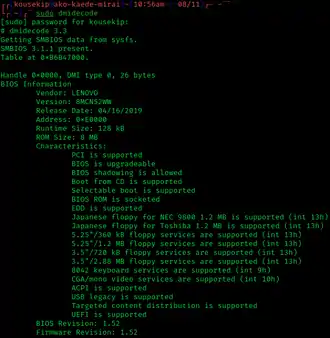 dmidecode is a free userspace command-line utility for Linux that can parse the SMBIOS data.[1][2] The name dmidecode is derived from Desktop Management Interface, a related standard with which dmidecode originally interfaced. SMBIOS was originally named DMIBIOS. The Linux kernel and other modern operating systems such as the BSD family contain an SMBIOS decoder, allowing systems administrators to inspect system hardware configuration and to enable or disable certain workarounds for problems with specific systems, based on the provided SMBIOS information. Information provided by this utility typically includes the system manufacturer, model name, serial number, BIOS version and asset tag, as well other details of varying level of interest and reliability, depending on the system manufacturer. The information often includes usage status for the CPU sockets, expansion slots (including AGP, PCI and ISA) and memory module slots, and the list of I/O ports (including serial, parallel and USB).[3][4] Decoded DMI tables for various computer models are collected in a public GitHub repository.[5]