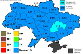 Yarosh was a candidate in the 25 May 2014 Ukrainian presidential election.[9] A poll conducted by the "Socis" research center (from 25 February – 4 March 2014) predicted that Yarosh's candidacy received the support of 1.6% of the people who were surveyed.[25] On election day he actually received 0.7% of the votes.[9] In January 2019 Yarosh stated he only took part in the election "not to destroy the revolutionary structures after the revolution".[26] He also stated that he was fully aware it was "virtually impossible" he could win the election and that because he was engaged in military action since the first days of April 2014 he did not campaign.[26]