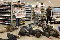 In March 2014, activists began organizing flash mobs in supermarkets to urge customers not to buy Russian goods[13][14][15] and to boycott Russian gas stations,[16][17][18][19] banks,[20] and concerts.[21] In April 2014, some movie theaters in Kyiv, Lviv, and Odessa began shunning Russian films.[22]