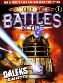 Doctor Who – Battles in Time[1] is an out-of-print trading card game and fortnightly magazine from the partwork publishers GE Fabbri, who acquired the license to produce Battles in Time. The game and magazine were first released in mid-April 2006 in two 'test-regions' in the United Kingdom and was made available across the UK on 20 September 2006. The magazine was released in Australia a few months later. However, only in South Australia was it made available in newsagents; in the rest of Australia it was available by subscription with the distributor only. The subscription and back issue services have now been removed from the official website. Battles in Time magazines are no longer available and the last issue (number 70) was released on 13 May 2009.
