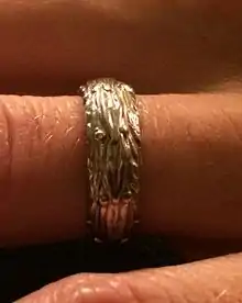 The Danish doctoral ring was introduced in 1824. The current design was created by medallist Harald Conradsen in 1866 and features a gold plate with a portrait of Pallas Athena surrounded by a laurel wreath. The ring is not awarded as such, but the doctoral title enables the recipient to purchase the figured plate from the University of Copenhagen which is the facilitator of this service.[1] If the doctor wishes it attached to an actual ring, the doctor must purchase this service from a jeweller at their own expense. The ring is normally worn on the index finger of the right hand.[1][2]