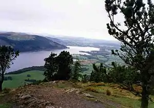 The top of the fell is marked by a stone memorial pillar with a brass plaque that says "In memory of John Lole and Ian Sandelands, Ist Seaton Scout Group". The view from the top is excellent for a fell of modest height, encompassing the entirety of Bassenthwaite Lake and Derwent Water as well as the high mountains of Scafell Pike, Great Gable and Bowfell 21 km away to the south; the hills of Dumfries and Galloway are also visible to the north-west. Computer-generated summit panorama
