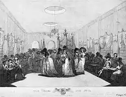 According to Edward Walford, the tavern gardens were used for popular concerts with an audience of "the riff-raff and scum of the town", which became a public nuisance.[7] The place gained a reputation for vice, being described as "a house in which gangs of both whores and rogues were constantly associated".[11] Highwaymen would carouse there before setting out on their depredations.[12] Francis Place reported that, as a boy, he had seen "two or three horses at the door of the Dog and Duck in St George's Fields on a summer evening, and people waiting to see the Highwaymen mount ... flashy women come out to take leave of the thieves at dusk and wish them success".[13][14]