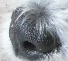 The wet nose, or rhinarium, is essential for determining the direction of the air current containing the smell. Cold receptors in the skin are sensitive to the cooling of the skin by evaporation of the moisture by air currents.[6]