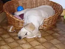 A dog toy is a toy that is specifically for dogs to play with. Dog toys come in many varieties, including dog bones, puppy toys, balls, tug toys, training aids, squeaky toys, discs and frisbees, plush toys, and sticks.