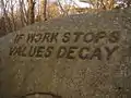 Most of the area of Dogtown is now a dense woodland, criss-crossed and bisected by trails and old roads. Dogtown Road off of Cherry Street in the western section (the Gloucester side) is lined with the remains of the cellar holes of the settlers, many of which are numbered in correspondence with names from John J. Babson's book of the history of Gloucester. Babson's grandson, Roger Babson, is known for, among other things, his commissioning of unemployed stonecutters to carve inspirational inscriptions on 36 boulders[5] in Dogtown during the Great Depression. Babson also mapped and numbered the cellar holes left from the homes of Dogtown's former residents.