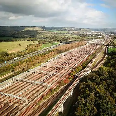 Dollands Moor Freight Yard is a railway freight yard near Folkestone in Kent, and was purpose built in 1988 for the Channel Tunnel. It is to the west of the Eurotunnel Folkestone Terminal, and just to the south of the M20 Motorway.