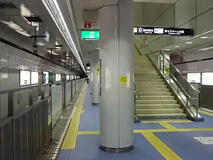 This station has 5 levels underground in order to take passengers from Osaka Dome (Kyocera Dome Osaka) smoothly. The 2nd basement functions as the ticket gate area and the 5th basement contains an island platform serving two tracks. Approximately 160 thousand bricks are used for the wall of the platform and tracks because there was formerly an Osaka Gas factory near this station which was made out of bricks.[1] The passage to ÆON Mall Osaka Dome City is located in front of the ticket gates.