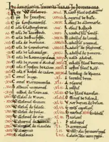 The manuscripts do not carry a formal title. The work is referred to internally as a descriptio (enrolling), and in other early administrative contexts as the king's brevia (writings). From about 1100, references appear to the liber (book) or carta (charter) of Winchester, its usual place of custody; and from the mid-12th to early 13th centuries, to the Winchester or king's rotulus (roll).[20][21]