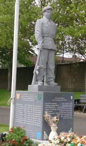In June 1973, McGlinchey's unit left a car bomb in Coleraine; six people were killed. McGlinchey was also active in internal security, particularly hunting down those he believed to be assisting the security forces. His victims included a caterer from Derry City who was employed at Fort George British Army base.[47] In March 1977 McGlinchey was allegedly part of a gang that killed 67-year-old Hester McMullan, a retired postmistress, in Toomebridge. They had already shot and wounded her son, an RUC reservist, and she died when they then fired on her house. The IRA claimed the attack.[48] A later commentator described how "the woman had been riddled with bullets during an attack on her house in the early hours of the morning, and other members of her family had narrowly escaped".[49] The SAS placed patrols to intercept McGlinchey in areas their intelligence expected him to be in the north, especially along the border. On one such occasion, believing him to be drinking in a specific bar, they raided the house, firing into the ceiling. The SAS reasoned that the patrons would throw themselves to the floor—all except McGlinchey, whom they expected to reach for a weapon and return fire. However, their intelligence was erroneous; McGlinchey was elsewhere.[50]