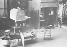 In March, 1962 Harvey Littleton, then a ceramics instructor at the University of Wisconsin-Madison, held the first of two week-long glassblowing workshops in a storage shed on the grounds of the Toledo Museum of Art. He had presented the workshop idea to the museum's director, Otto Wittmann, who agreed to it perhaps, Littleton suggested, as a means to draw a broad public to the museum.[7] An industrial glass town, Toledo was home to the Libbey Owens Ford Company, as well as Johns-Mansville, which had purchased Toledo's L.O.F. Glass Fibers company in 1958.[8] Littleton enlisted Labino's help in the workshop for his knowledge of glassblowing's technical aspects. Labino initially advised Littleton about the type of fire bricks to use in the construction of the furnace for the workshop. Labino also donated the steel and burner for the furnace, while Littleton brought the bricks from his studio in Wisconsin.[9] Thus the stage was set for the seminal event of the Studio Glass Movement. The workshop, which began on March 23, did not start out smoothly.