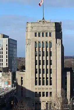 The Dominion Public Building is an Art Deco office building located on Richmond Street in the heart of London, Ontario, Canada. Construction on the building started in 1935 and concluded with the building's inauguration in September 1936.[1] The Dominion Public building was a result of the Public Works Construction Act of 1934 which laid out a plan to reinvigorate Canada's economy through public works projects.[2] The building was designed by Chief Public Works Architect Thomas W. Fuller with the help of three London architects: John MacLeod Watt, Victor Joseph Blackwell and Roy O. Moore.[3] The building displays a physical essay of "the New Classicalism or Modern Classicalism"; this architectural approach is a take on the Art Deco style of architecture and is what highlights this building as a piece of Canadian Heritage.[3]