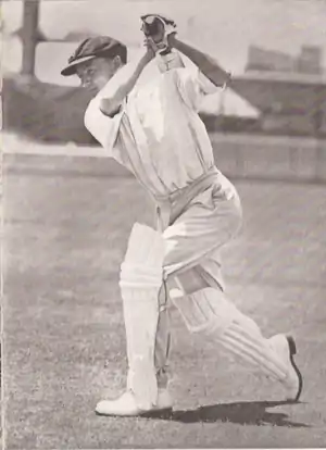 Employing a wide, side-on stance at the crease, Bradman preferred to keep perfectly still as the bowler ran in.[3] Placing the bat between his feet (rather than behind his rear foot) was another unorthodox feature of his game.[4] All these elements combined to give his backswing a "crooked" look, in that the face of the bat pointed at the slips cordon, rather than going straight, as advised in the coaching manuals. This "crookedness" troubled his early critics, but Bradman resisted any major technical changes and it became a moot point after he broke the record for the most runs in a Test series during the 1930 tour of England.[5]