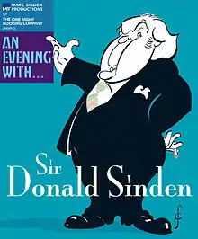 Sinden was a leading figure in the campaign to found the Theatre Museum in London's Covent Garden in the 1980s.[5] In 2007, Sinden embarked on a UK, European and American theatre tour to talk about his life, work and anecdotes in An Evening with... Sir Donald Sinden. Produced by his son Marc, this included, on 8 November 2007 as part of Marc's British Theatre Season, Monaco, a performance in front of Prince Albert of Monaco (the son of Grace Kelly, his co-star in the film Mogambo) at the Théâtre Princesse Grace, Monte Carlo.[17]