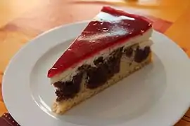 Donauwelle (literally 'Danube wave' in German) is a traditional sheet cake popular in Germany and Austria. It is made of layers of plain and chocolate pound cake combined to have a wavy border between them. It contains sour cherries and is topped with buttercream and chocolate glaze.