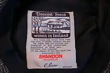 Donegal tweed is a woven tweed manufactured in County Donegal, Ireland. Originally all handwoven, it is now mostly machine woven and has been since the introduction of mechanised looms in the 1950s-1960s. Donegal has for centuries been producing tweed from local materials in the making of caps, suits and vests. Towards the end of the eighteenth century, The Royal Linen Manufacturers of Ulster distributed approximately six thousand flax spinning wheels and sixty looms for weaving to various Donegal homesteads. These machines helped establish the homespun tweed industry in nineteenth-century Donegal.[1] Although Donegal tweed has been manufactured for centuries it took on its modern form in the 1880s, largely due to the pioneering work of English philanthropist Alice Rowland Hart.[2]