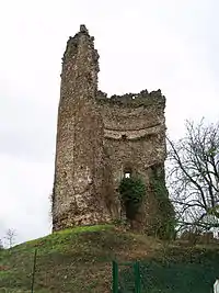 Today, only the keep, which is 20 m (66 ft) high, remains on a low motte. A farm leans on the ruins.