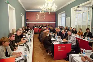 The International Conference to Promote the Resolution of the Conflict in the Basque Country — more widely known as the Donostia-San Sebastián International Peace Conference — was a conference aimed at promoting a resolution to the Basque conflict,[1] which took place in Donostia-San Sebastián (Basque Country) on October 17, 2011, at Aiete Palace. It was organized by the Basque citizens' group Lokarri, and included leaders of Basque parties,[2] as well as six international personalities known for their work in the field of politics and pacification: Kofi Annan (former UN Secretary-General), Bertie Ahern (former Taoiseach of Ireland), Gro Harlem Brundtland (international leader in sustainable development and public health, former Prime Minister of Norway), Pierre Joxe (former Interior Minister of France), Gerry Adams (president of Sinn Féin, member of the Irish Parliament) and Jonathan Powell (British diplomat who served as the first Downing Street Chief of Staff). Tony Blair — former Prime Minister of the United Kingdom — could not be present due to commitments in the Middle East,[1] but he supported the final declaration. The former US President Jimmy Carter (2002 Nobel Peace Prize) and the former US senator George J. Mitchell (former United States Special Envoy for Middle East Peace) also backed this declaration.[3]
