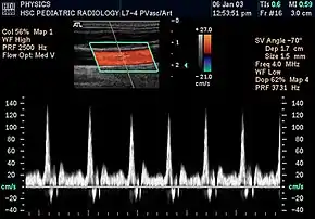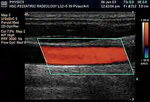 Doppler ultrasonography is medical ultrasonography that employs the Doppler effect to perform imaging of the movement of tissues and body fluids (usually blood),[1] [2] and their relative velocity to the probe. By calculating the frequency shift of a particular sample volume, for example, flow in an artery or a jet of blood flow over a heart valve, its speed and direction can be determined and visualized. Color Doppler or color flow Doppler is the presentation of the velocity by color scale. Color Doppler images are generally combined with grayscale (B-mode) images to display duplex ultrasonography images, allowing for simultaneous visualization of the anatomy of the area.
