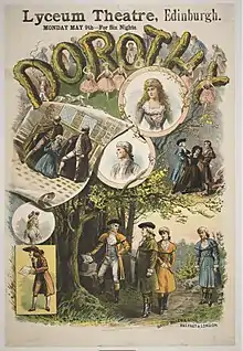 The revised Dorothy became a great success at the box office and had an initial run of 931 performances, breaking the record for the longest-running musical theatre production in history and holding this record until the run of the musical play A Chinese Honeymoon in the early 1900s.[7] It was also the second longest known run for a stage production of any kind, after Our Boys, an 1875 vaudeville play, until both were surpassed by the run of Charley's Aunt in the 1890s.[7] The show's hit songs included the ballad "Queen of My Heart", "Be Wise In Time", "Hark For'ard!", "With A Welcome To All", and "The Time Has Come." Henry Leslie made so much money from Dorothy that he was able to build the Lyric Theatre, where the show transferred in 1888. The success of the show also spurred revivals of some of Cellier's earlier works.[8] Some critics reconsidered their earlier condemnation, the work became regarded as a classic Victorian piece,[4] and the initially despised plot was traced seriously back to the Restoration playwrights David Garrick and Aphra Behn, and to Oliver Goldsmith and even Shakespeare.[9]