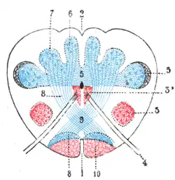 ![]() Present at the junction between the spinal cord and medulla oblongata, the dorsal column nuclei consist of paired gracile, and cuneate nuclei (labels 6 and 7, respectively). | |
