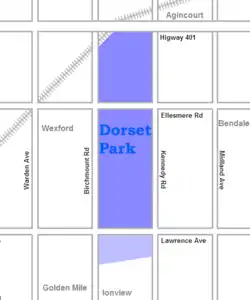 Dorset Park is a neighbourhood in Toronto, Ontario, Canada. It is located in the western part of the district of Scarborough. The neighbourhood is bordered by Highway 401 to the north, Midland Avenue to the east, Lawrence Avenue to the south, and Birchmount Road to the west. Kennedy Road runs along the neighbourhood's centre north and south and Ellesmere Road runs along the centre east and west. The area south of Lawrence Avenue, north of the hydro corridor, is known as McGregor Park and is often included as part of Dorset Park.