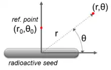 The calculation of radiation dose from radioactive seeds is crucial in the planning and administration of brachytherapy treatments. Most modern calculation are done using the formalism published by the American Association of Physicists in Medicine.[1] For the geometry in figure 1, this formalism uses five parameters.