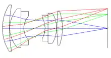 The original two element Gauss was a telescope objective lens consisting of closely spaced positive and negative menisci, invented in 1817 by Carl Friedrich Gauss as an improvement to the Fraunhofer Achromatic telescope objective lens by adding a meniscus lens to its single convex and concave lens design.[5] Alvan Clark and Bausch & Lomb further refined the design in 1888 by taking two of these lenses and placing them back to back making a "double Gauss"[6] with indifferent photographic results.[7] Current double Gauss lenses can be traced back to an 1895 improved design, when Paul Rudolph of Carl Zeiss Jena thickened the interior negative menisci and converted to them to cemented doublets of two elements of equal refraction but differing dispersion in the Zeiss Planar of 1896[8] to correct for chromatic aberration. It was the original six element symmetric f/4.5 Double Gauss lens.[9] Horace William Lee added a slight asymmetry to the Planar in 1920, and created the Taylor, Taylor & Hobson Series 0 (also called the Lee Opic, UK) f/2 lens.[10] It was commercially unsuccessful, but its asymmetry is the foundation of the modern Double Gauss, including the Zeiss Biotar.[11] Later the design was developed with additional glasses to give high-performance lenses of wide aperture. The main development was due to Taylor Hobson in the 1920s, resulting in the f/2.0 Opic and later the Speed Panchro designs, which were licensed to various other manufacturers. In 1927, Lee modified the Opic design and increase the maximum aperture up to f/1.4, that is the Ultra Panchro lens. Further improvement was done by Lee in 1930, the Super Speed Panchro.[12] It was a f/1.5 fast design with 7 glasses in 5 groups, which soon became new popular of fast speed lens type and was cited by many lens manufacturers until the 1960s.