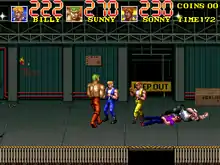 Double Dragon 3 can be played by up to two or three players simultaneously, similarly to The Combatribes. The first two players control returning heroes Billy and Jimmy Lee respectively, while the third player controls a new character named Sonny (a yellow-clad palette swap of the Lee brothers). The controls consist of an eight way joystick and three buttons again, but the combat system has been greatly altered from previous games. The game discards the directional attack buttons from Double Dragon II: The Revenge, returning to the punch and kick format of the original Double Dragon. However, moves such as the elbow strike and the hair grab had been removed and new abilities replaced them. The player can now run by pushing the joystick left or right twice and perform moves with a second player such as a back-to-back hurricane kick when standing near each other and a triangle jump kick when one player jumps towards the other. Other new moves include a running head-butt, a belly-to-back throw and a jumping knee drop.