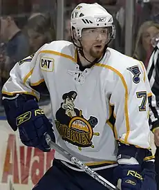 On August 3, 2005, he was traded to the St. Louis Blues with Eric Brewer and Jeff Woywitka in exchange for Chris Pronger.[3] He never played a game for the Blues, instead having spells with the AHL's Peoria Rivermen and the ECHL's Alaska Aces. In 2007, Lynch signed with Austrian side Red Bull Salzburg.