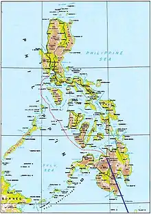 MacArthur responded with a request that he might select the time of his departure. "Unless the right moment is chosen for this delicate operation", he wrote, "a sudden collapse might occur."[24] "With regard to the actual movement", he went on, "I deem it advisable to go to Mindanao by combined use of surface craft and submarine, and thence by air, further movement by submarine being too time consuming."[24] Marshall replied that Roosevelt would allow him to choose the time and method of his departure.[26] ABDA was dissolved on 27 February, and MacArthur nominally came under Dutch command, but was ordered to continue communicating directly with the War Department.[25]